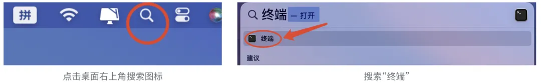 - 打开终端(点击桌面右上角🔍搜索图标,搜索:终端)