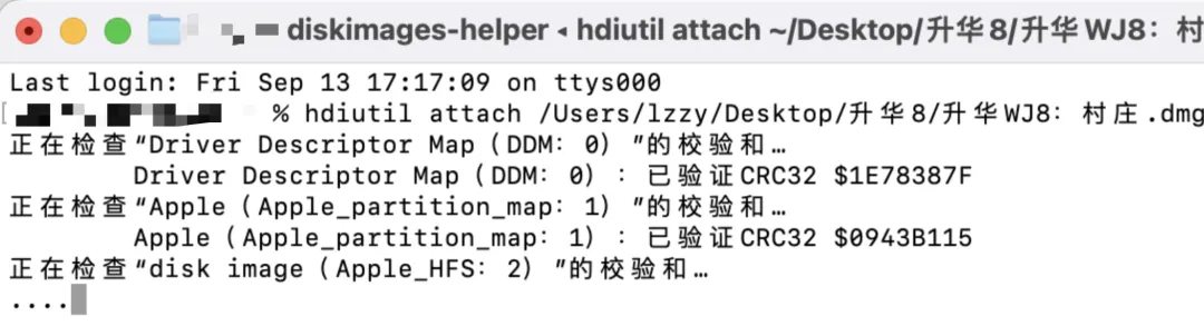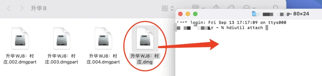 3.将分段安装包中的名称为 ***.dmg 的文件拖进终端
