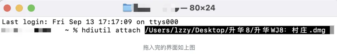 将分段安装包中的名称为 ***.dmg 的文件拖进终端,如图