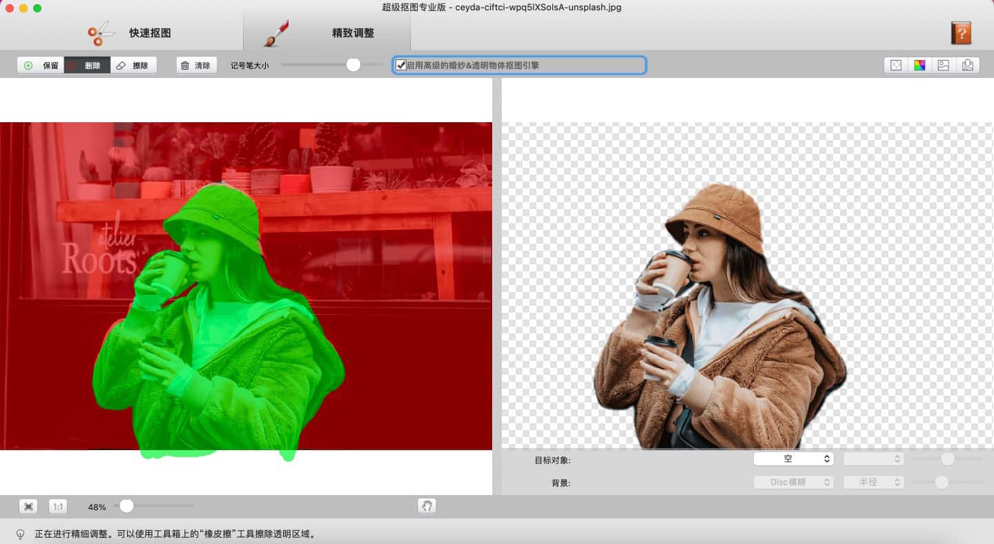 3 快速精准地去除图片中的复杂背景。提供两种抠图方式:快速抠图和精致抠图。