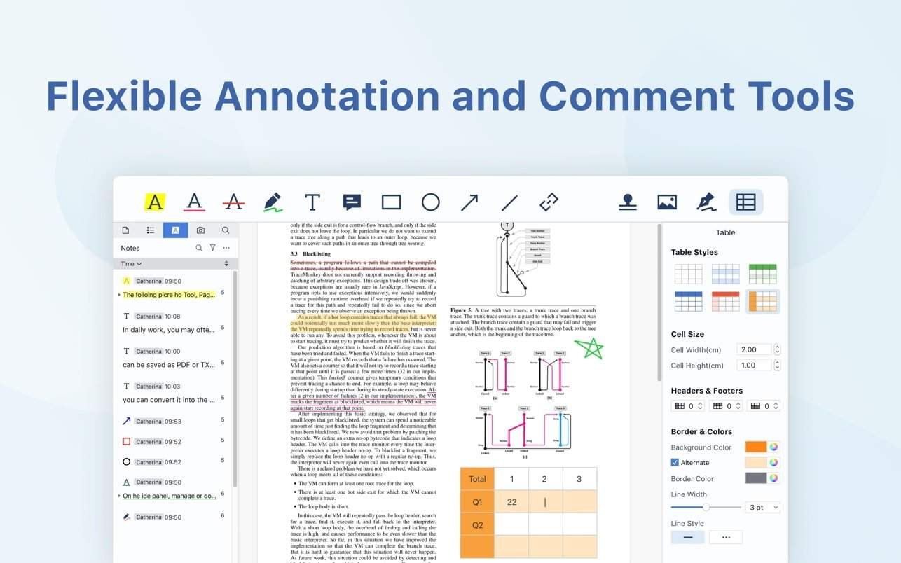 ・使用专业PDF注释工具标记文档的重要信息: 高亮、下划线、删除线、手绘、文本框、便签、形状(矩形、圆形,箭头,直线)等。可连续添加批注工具