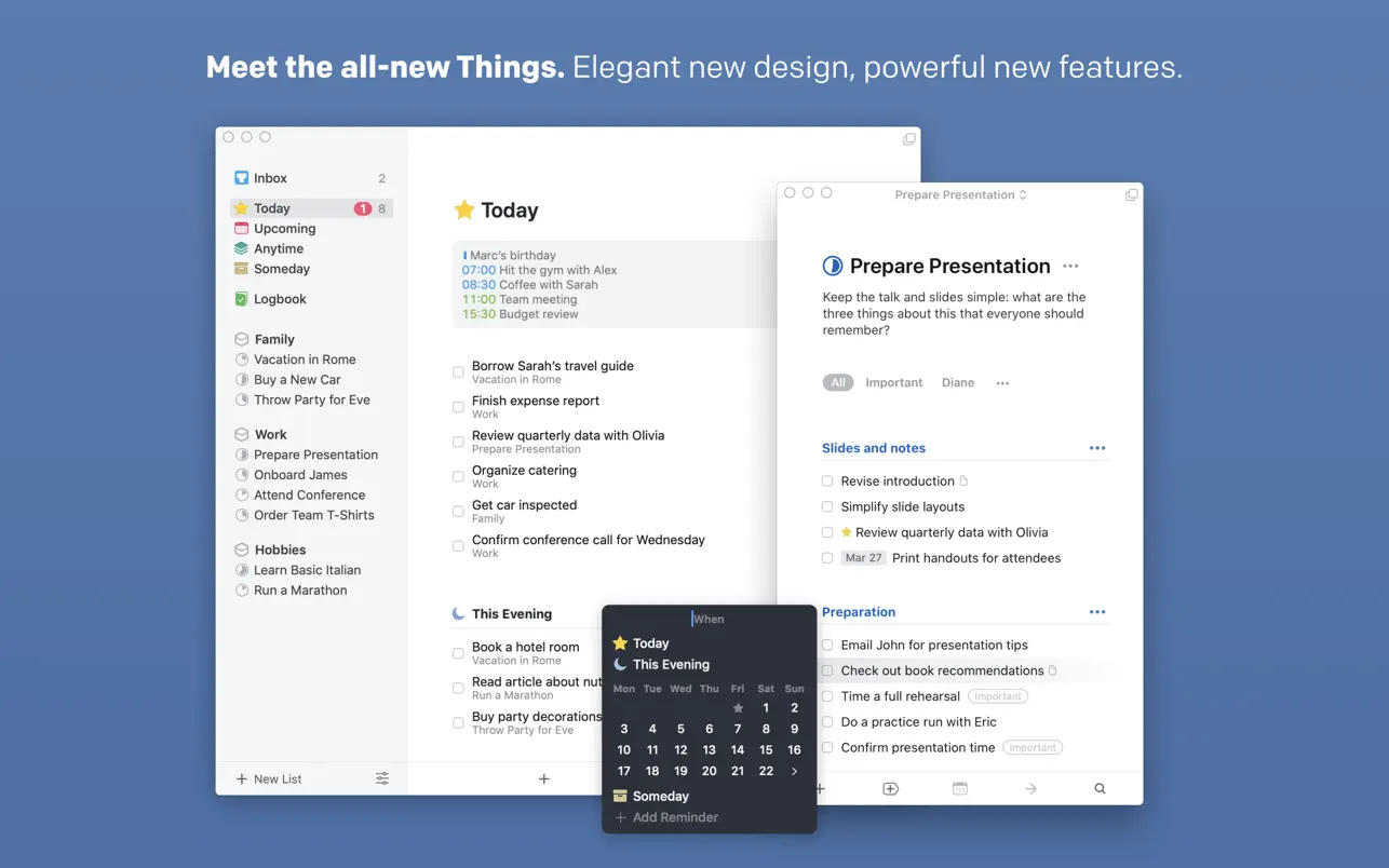 屡获殊荣的任务管理程序强势回归,并呈现出崭新面貌 – 采用永不过时的新式设计、令人愉悦的新型交互方式,并具有面面俱到且十分强大的全新功能。