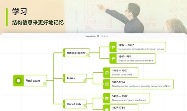 •3个不同的模板(1个基本层次结构和您可解锁的2个额外的模板,它们可更创意地组织您的想法);