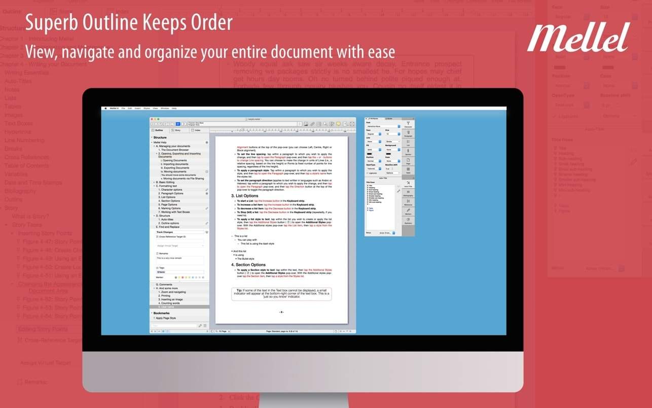 真正的作家使用Mellel 5写作。它可以处理所有较长篇幅的书面作品,无论是论文,手稿还是小说。它为您提供了编写过程各个方面所需的控制权:大纲,脚注,参考书目,样式等。从最初的想法到最终的手稿,Mellel使您可以在整个过程中使用一个可靠的工具:您所要做的就是编写它。