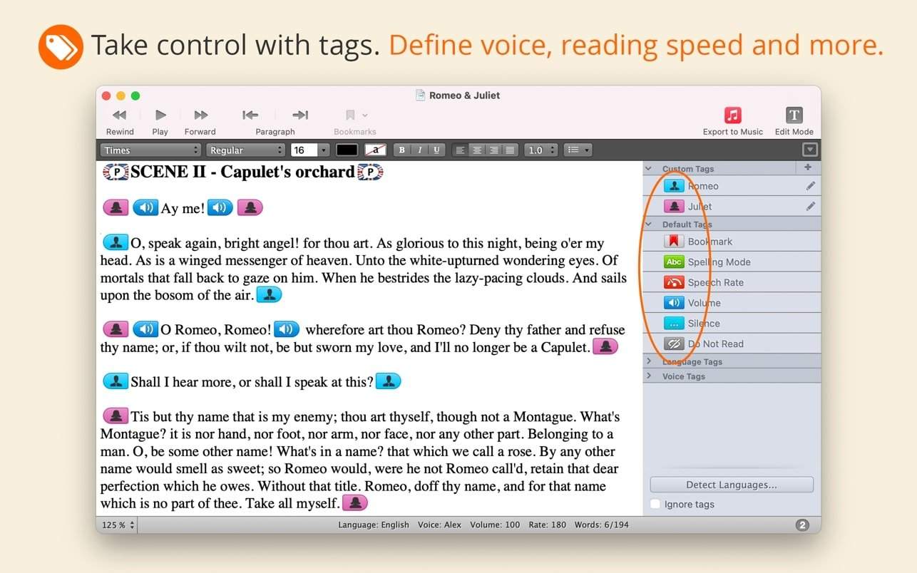 GhostReader Plus还允许您收听Mac上的几乎任何文本。让GhostReader Plus从其他具有完全播放控制功能的应用程序中读取所选文本,在您执行其他操作时聆听Word,PDF和其他文档,将文本导出到iTunes音轨以便随时随地收听或使用GhostReader Plus编写和校对您的工作。