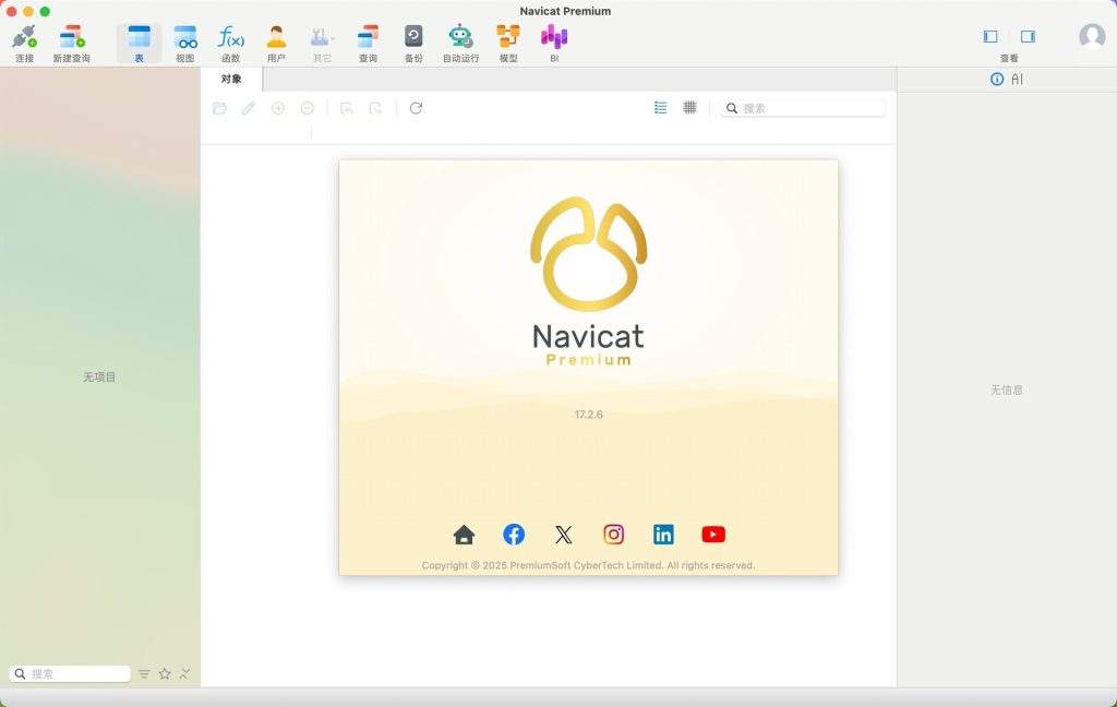 Navicat Premium 是一套数据库开发工具,让你从单一应用程序中同时连接 MySQL、MariaDB、MongoDB、SQL Server、Oracle、PostgreSQL 和 SQLite 数据库。它与 Amazon RDS、Amazon Aurora、Amazon Redshift、Microsoft Azure、Oracle Cloud、MongoDB Atlas、阿里云、腾讯云和华为云等云数据库兼容。你可以快速轻松地创建、管理和维护数据库。