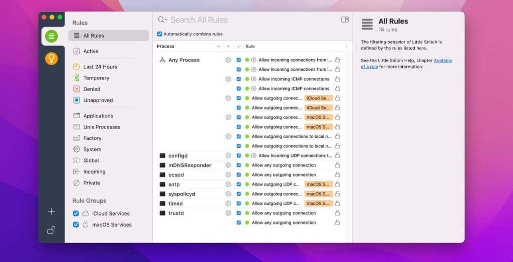 Little Snitch for Mac是一款Mac的个人安全软件,能防止应用程序在你不知道的情况下自动访问网络,你可以定义不允许访问。如果你担心你的Mac连接到你不想去的地方,用它保护你。如果你安装了某些破解软件,可以用Little Snitch来阻止这些软件的网络连接,这样就可以屏蔽官方的正版检测。