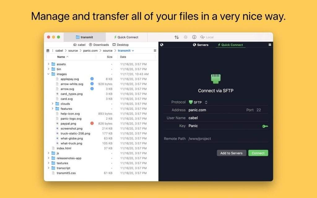 Transmit也非常谨慎,让您组织您的服务器以便快速访问。通过Panic Sync,您可以将它们同步到所有电脑。切勿再次输入服务器地址。