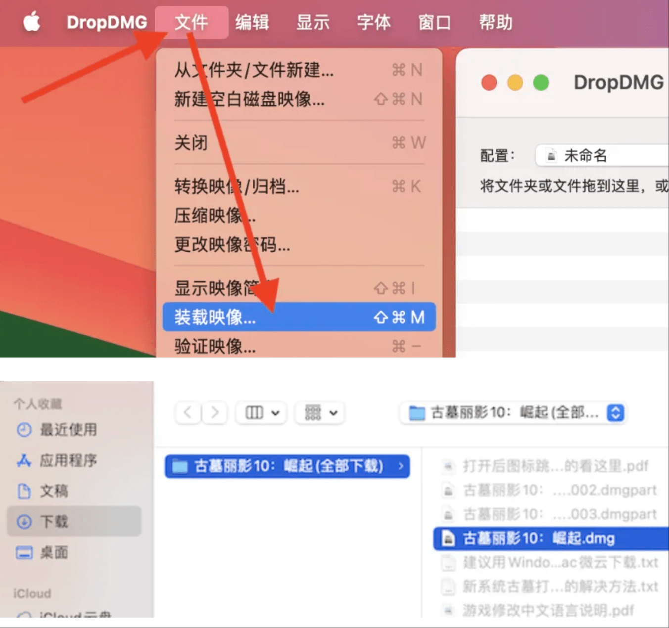 2.点击该软件的上方菜单栏里的“文件”—“装载映像…”,找到并选择你已经下载好的游戏安装包的“xx.dmg”主文件,然后等待装载完成后,桌面上就会出现该游戏的安装磁盘图标!接下来正常安装就可以了。(装载时间根据游戏的容量大小有所不同,耐心等待)