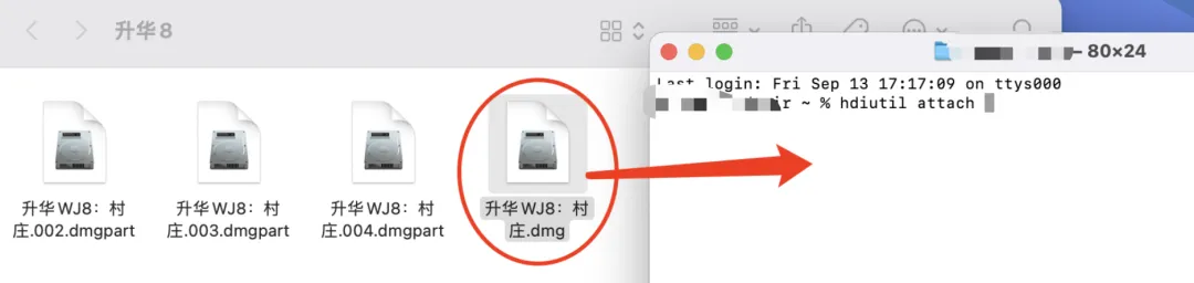 将分段安装包中的名称为 ***.dmg 的文件拖进终端,如图