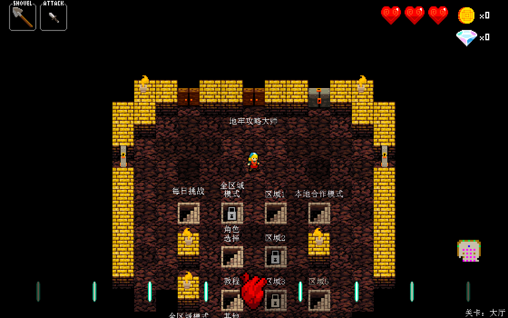 游戏共有4个区域,大厅里有商人若干,玩家在游戏里得到的金钱可用于购买一些辅助道具或属性加成。每个区域都有关底BOSS,各地图的音乐放完以后就会强制玩家进入下一关,在遇到地板上的门的时候玩家也可选择进入隐藏BOSS战,胜利以后回到大厅。